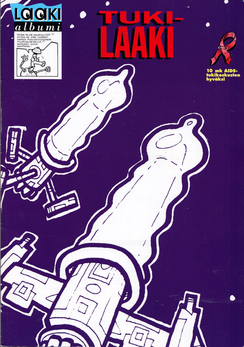 [21 x 30 cm pysty albumi; 64 s. + kannet; sisäkansissa ’tapettina’ musta-punaisella kondomiraketteja (T.K.); kannet väri (kannessa violetti-valkoisella osasuurennos sk:sta s. 14 + lad. pun. vers. mustin varjoin otsikko + upot. piirros ”red ribbon”, alla lad. gem. kelt. ”10 mk AIDS-tukikeskusten hyväksi”, ruutu s. 14, ”Laaki-albumi” -logo; selkä musta, lad. valk. gem. ”Tuki–Laaki”; tk väri, oranssissa ja vaalenavihreässä kentässä lad. msutalla gem. esittelytekstit + mv-sininen logo + kaksi valmista värikantta + omassa kentässä ISBN-viivakoodi; s. 1 Nimiö (JM väripiirros ”Elä laakase, naatitaan!” + ots. + logo + lad. gem. ”Tämän albumin myyntihinnasta 10 markkaa tilitetään Suomen AiIDS.tukikeskuksille (logo ja keräyslupa) + ”Opetusministeriön kulttuuriosasto ja Taiteen keskustoimikunta ovat tukeneet Laaki-albumien kotimaisia sarjakuvia.”; s. 2–3 sisällysluettelo, kust.tiedot (idearyhmä Sari Luhtanen, Timo Varpio & K.P., asiantuntija Matti Hyvönen, ulkoasu Pentti Nuortimo) ja omistus; s. 4–24 mv sk sivun taitossa (ulkomaiset: Howard Crusen ”Piirtäjän pulmia”; Ulf Lundkvistin ”Haastattelu”, David Mazzucchellin ”Mope & Grope”, Patrick Marcelin ”Yön saalistaja”, Ralf Königin turvaseksisarjikset ”114 askelmaa”, ”Spermalasti Hot Rubberissa”, ”Luulosairas” ja ”Sano sitten kun tulee!!”; s. 25–40, 61–62 väri-sk (ulkomaisia Dupuy & Berberianin ”Hyvässä huudossa”, Freddy Miltonin ”Viljami – Ammattimaista protestia”, Sidney & Bomin ”Tyttöjen kesken” ja H. Casaglian ”Timothy”; s. 25–32 Mämmilöiden alla tekstilaatikoissa lad. ”Asiaa HIV:stä, AIDSista ja tukikeskustoiminnasta”; s. 63 mainos Maisa & Kaarina -korut (piirroksia ja valokuvia); s. 64 mainos Punaniska-albumisarja (väripiirros + 15 kansikuvaa)]